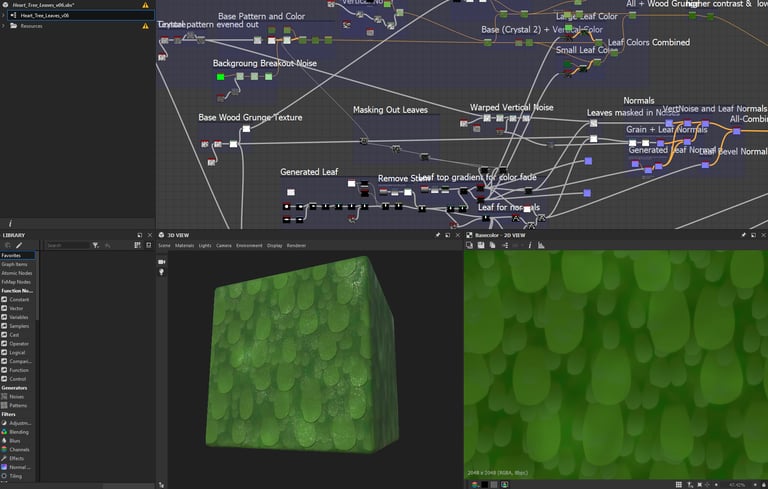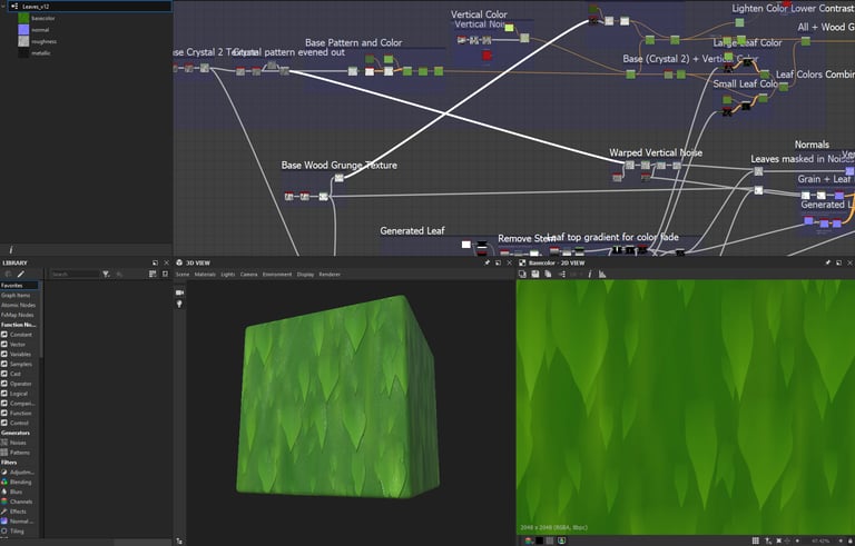 Created or modified stylized PBR materials using Substance Designer, Substance Painter, and UE4’s in-engine material/shader graphs; Typically worked on look-tests to define style in collaboration with the team, and then passed those as references onto our in-house 3D artist for additional texture authoring on the remaining assets; Also created materials that were used in-game (see willow leaf example)