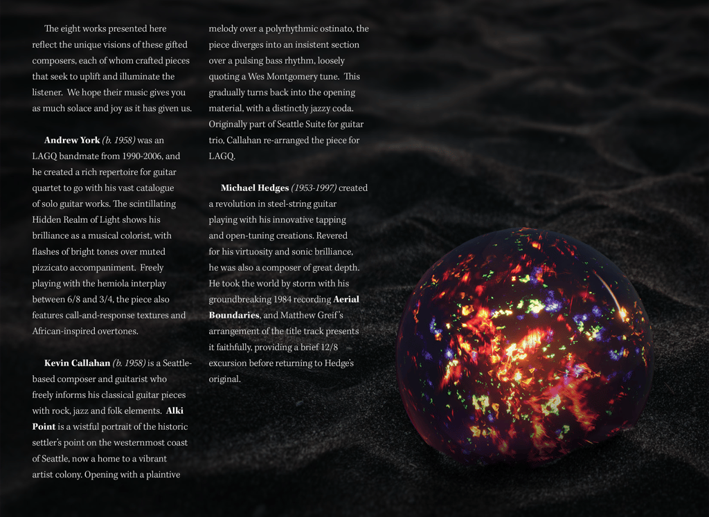 I was part of the team that developed the album's aesthetics early on, and assisted LAGQ in the review of deliverables provided by the graphic design team.