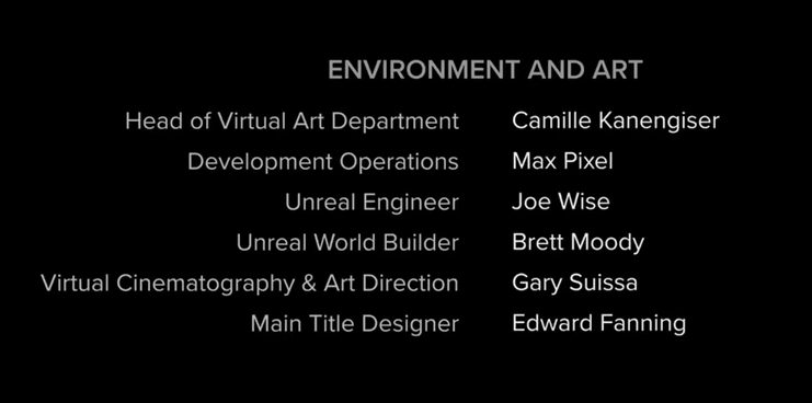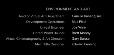 As Head of the Virtual Art Department, I managed a small team of artists to kitbash and create the sets, lighting, in-engine materials. Within just the first few hours of meeting the team, I had lead the charge to organize our pipeline, delegated roles to specific artists based on their skills and interests, established how we'd track tasks (classic kanban with post-its!), and worked with folks to implement assets into the scenes. I also handled the cross-department communications, working directly with the mocap and story leads to determine what they needed our art to support.